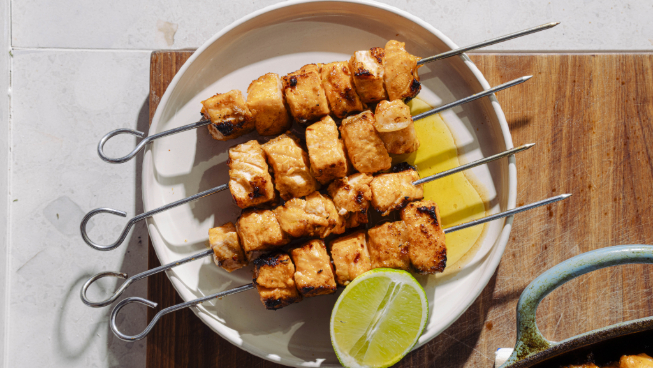 Place salmon skewers over or alongside the labneh. Garnish with fresh herbs and serve with extra lime wedges.