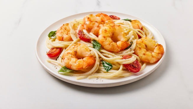Add cooked pasta to the pan with prawns, tomatoes, and basil, and toss to coat. Season to taste.