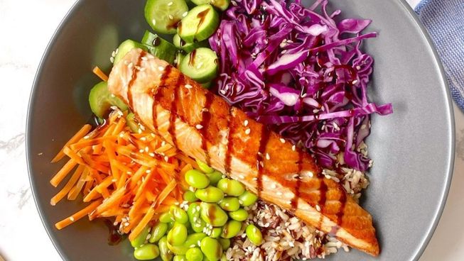 Top each bowl with cooked salmon and a drizzle of Teriyaki sauce and a sprinkle of sesame seeds on top