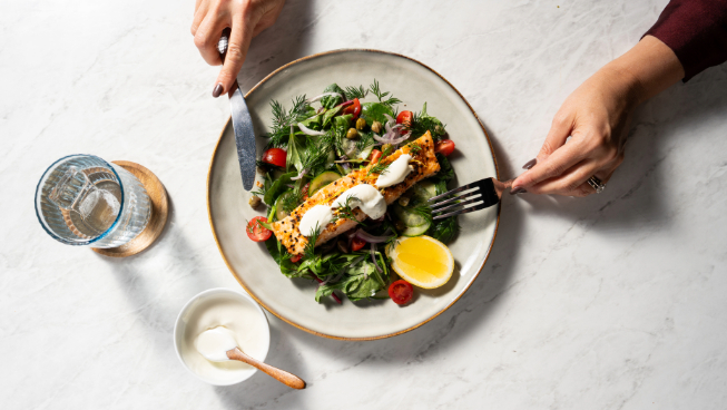 While the salmon cooks, prepare the salad. In a large bowl, combine rocket, sliced cucumber, capers, and fresh dill fronds.