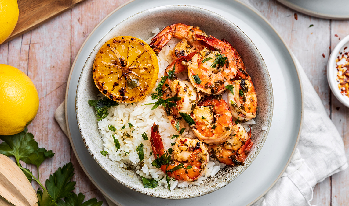 Add the prawns and lemon halves (cut side down) to the pan. Saute the prawns until pink and opaque, about 2-3 minutes each side. Remove the lemon halves last, they should be slightly charred.