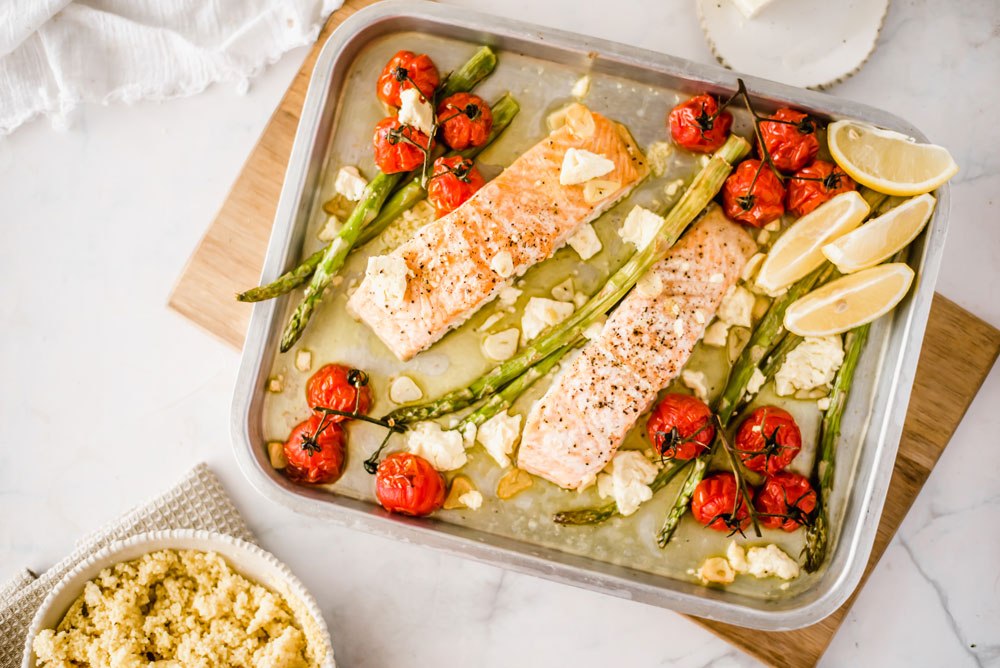 Preheat the oven to 180ºC. Arrange the salmon, cherry tomatoes, garlic and asparagus over a large baking tray. Drizzle with oil and season with salt and pepper, cook for 10 mins. Remove and add crumbed feta, return to the oven for 5 mins or until salmon is cooked