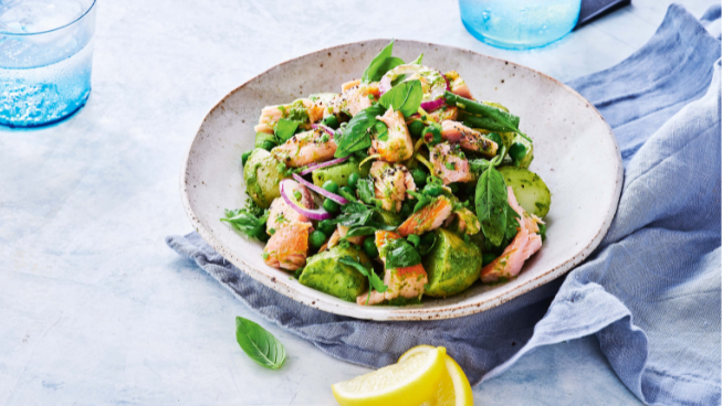 Cook the potato in a large saucepan of boiling water for 12-15 mins or until tender, adding peas for the last 1 min of cooking. Drain. Set aside for 15 mins to cool. Transfer to a large bowl. Add onion and half the salmon. Season and toss to combine.