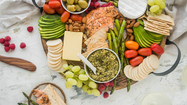 Heat oil in a griddle pan. Once hot add the asparagus the cook turning every now and then for 2-3 mins. Remove and allow to cool. Assemble all of the ingredients on a cheese board and enjoy!