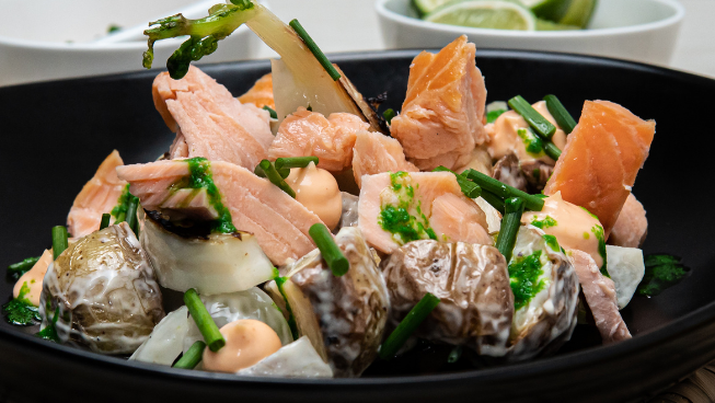 Cooked Salmon with potato, pickled onion and spicy mayo salad
