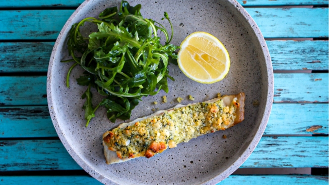 Place the barramundi butter side up on a baking tray lined with baking paper and bake at 200°c for 15 minutes until golden and flaky.