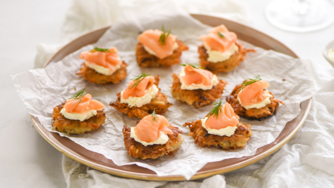 Arrange the rosti’s on a large platter and then top with 1tsp of cream cheese and a small piece of salmon. Top with a piece of dill and serve with lemon wedges.