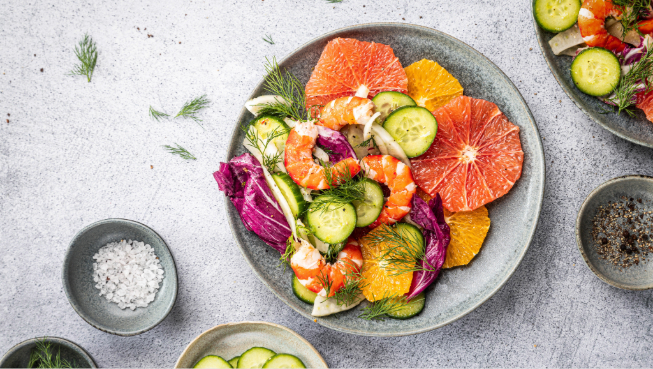 Add orange and grapefruit slices in a single layer on a serving plate. Top with prawn and fennel salad mixture. Serve immediately.