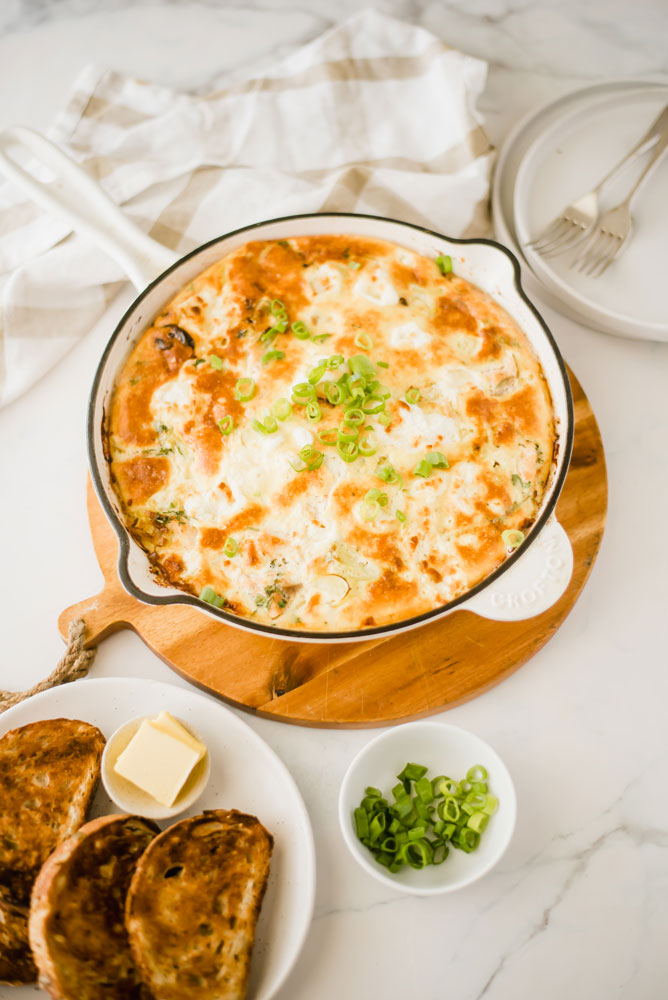 Pour over the egg mixture and then top with goats cheese. Bake in the oven for 20 mins or until eggs are just set in the middle.