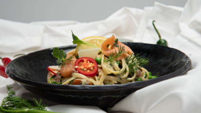 Salmon, garlic and white wine sauce linguini