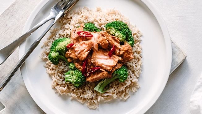 Check salmon and gently pull apart into chunks and coat with curry sauce. Serve straightaway with rice, broccoli and chilli on top and enjoy!