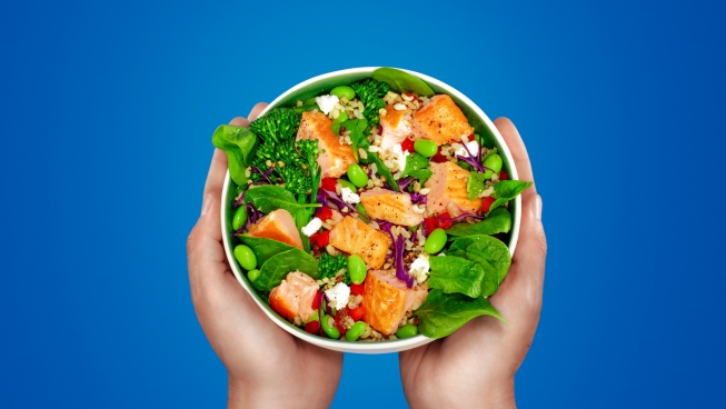 Arrange spinach leaves and red cabbage in the base of two wide bowls. Spoon over dressed grains: add broccolini, edamame, diced capsicum and crumbled cheese. Break salmon into bite size pieces and arrange over the top of the salad. Serve with lemon wedges and extra ground black pepper.