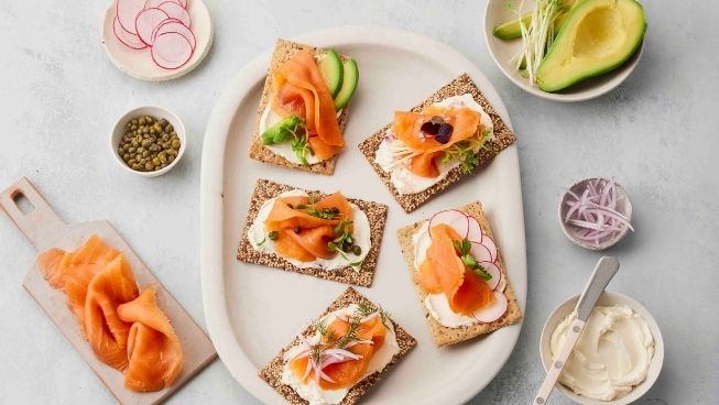 Spread cream cheese over crackers, top with a slice of salmon and your choice of garnishes.