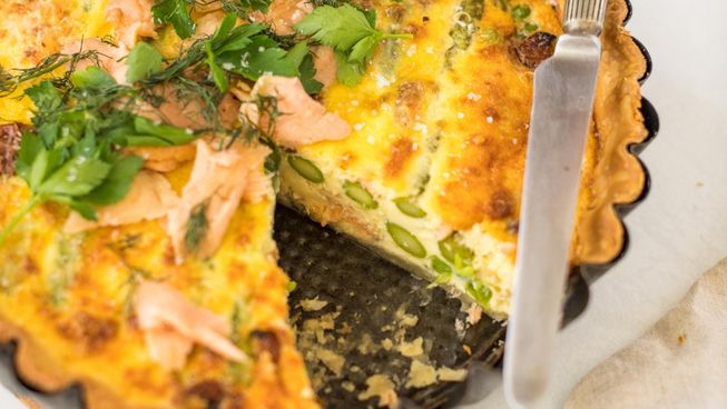 Arrange the smoked salmon pieces, green peas, asparagus, semi dried tomatoes on the base of the dish and then carefully pour over the egg and cream mixture to fill. Sprinkle over parmesan cheese and return to the oven for 30 mins. The top should be golden, and the egg just set. Allow to cool for 10mins before slicing.