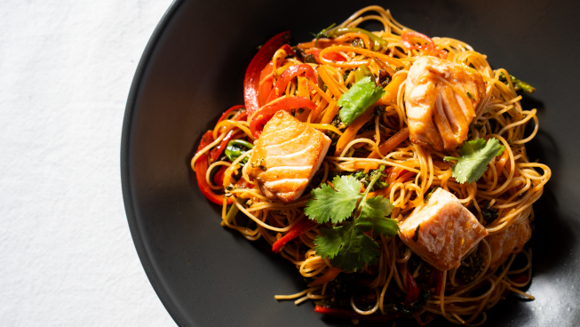 Gently fold the salmon back through the noodles, taking care not to break it up too much. Warm through for 1–2 minutes.