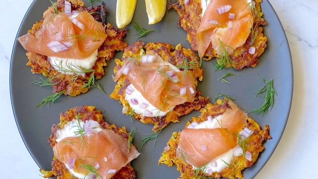 Top each rosti with a spoonful of Greek yoghurt, Tassal Smoked Tassie Salmon, fresh dill and a squeeze of fresh lemon.