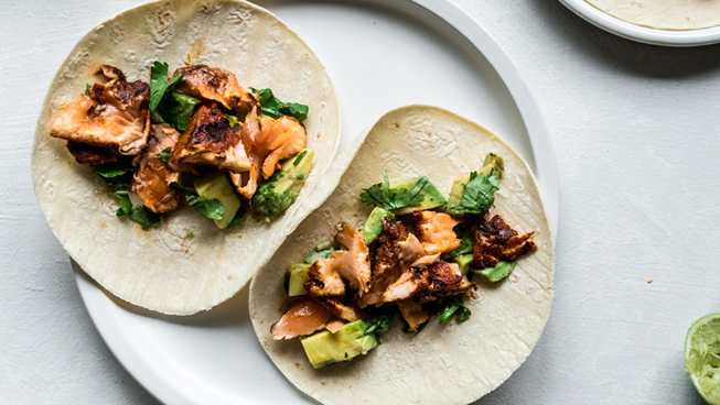 Place a spoonful of avocado and herbs onto each warmed corn tortilla, then add spice salmon pieces and enjoy!